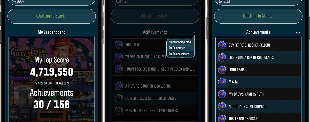 When you navigate/scan to a machine, the Scorbit attract mode (“Waiting to Start”) now includes your achievements count when there are achievements for that game machine title. If you tap on that achievement count, or swipe across the leaderboards, the final panel now includes a full list of achievements available for that game.